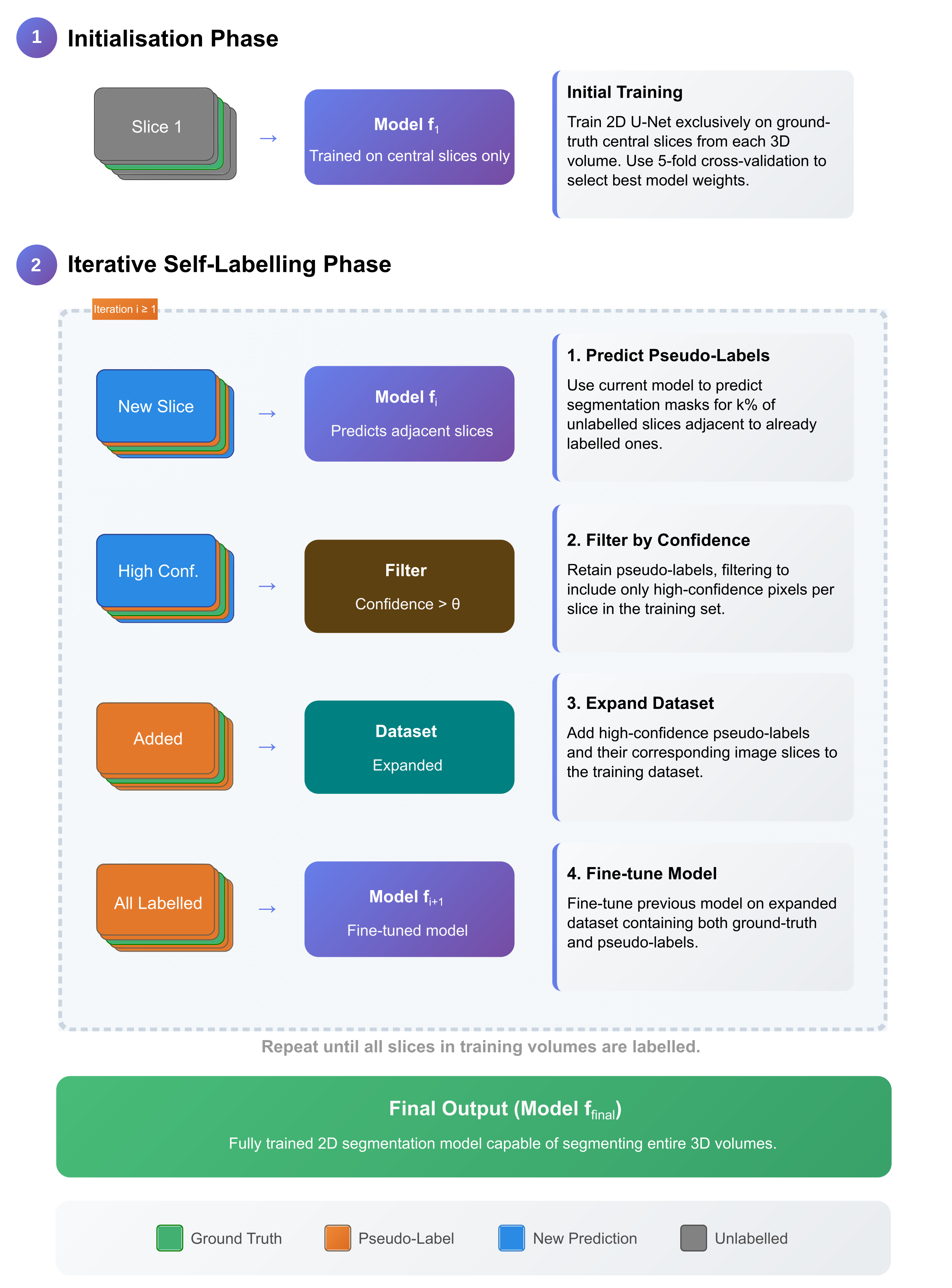 An incremental 2D self-labelling framework for segmenting 3D medical volumes from a single annotated slice per volume. . A 2D U-Net is first trained on these central slices. The model then iteratively generates and filters pseudo-labels for adjacent slices, progressively fine-tuning itself on an expanding dataset. This process is repeated until the entire training set is pseudo-labelled to produce the final model.