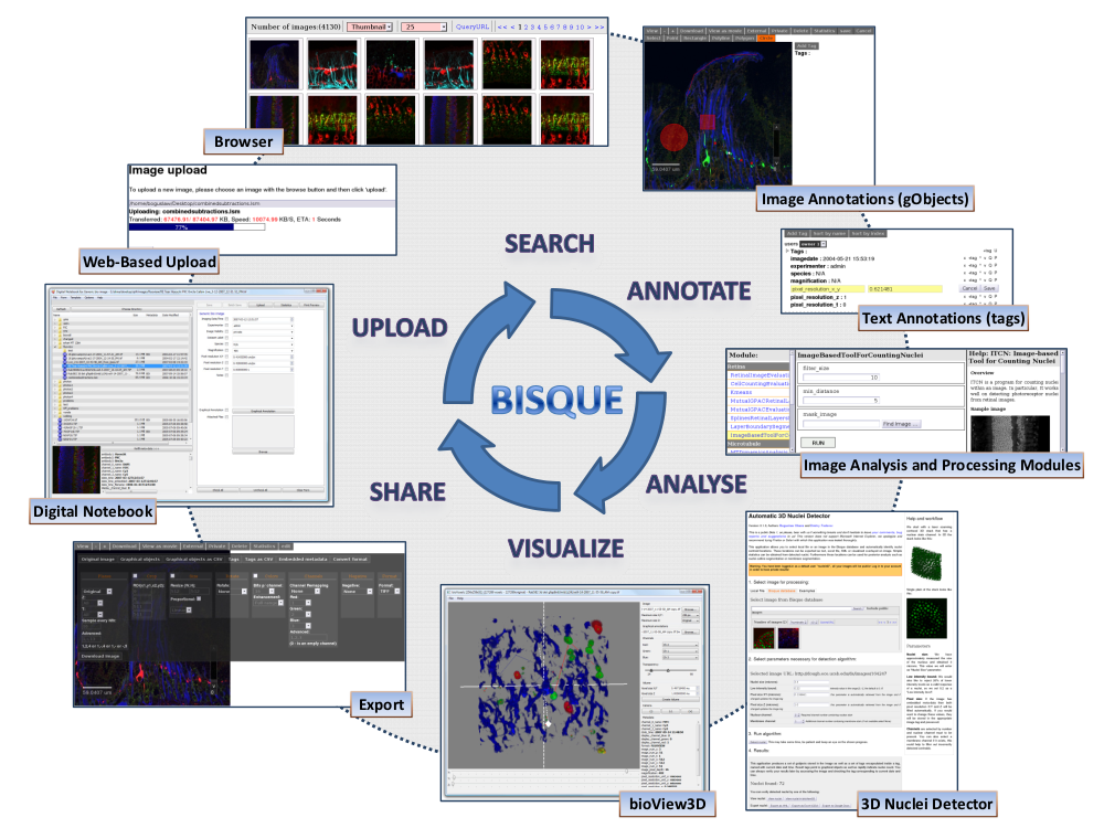 Bisque provides a platform for data sharing, flexible metadata management, and integrated extensible image analysis and processing. Bisque system is used by many research and commercial institutions including: 1) iPlant: a community of researchers, educators, and students working to enrich all plant sciences through the development of cyberinfrastructure that are essential components of modern biology. 2) Pfizer - The Pfizer Neuroscience Research Unit is developing quantitative methods that process the images, keeping track of the processing workflow, and allowing scientists to create new work flows that seamlessly combine multimodal data.