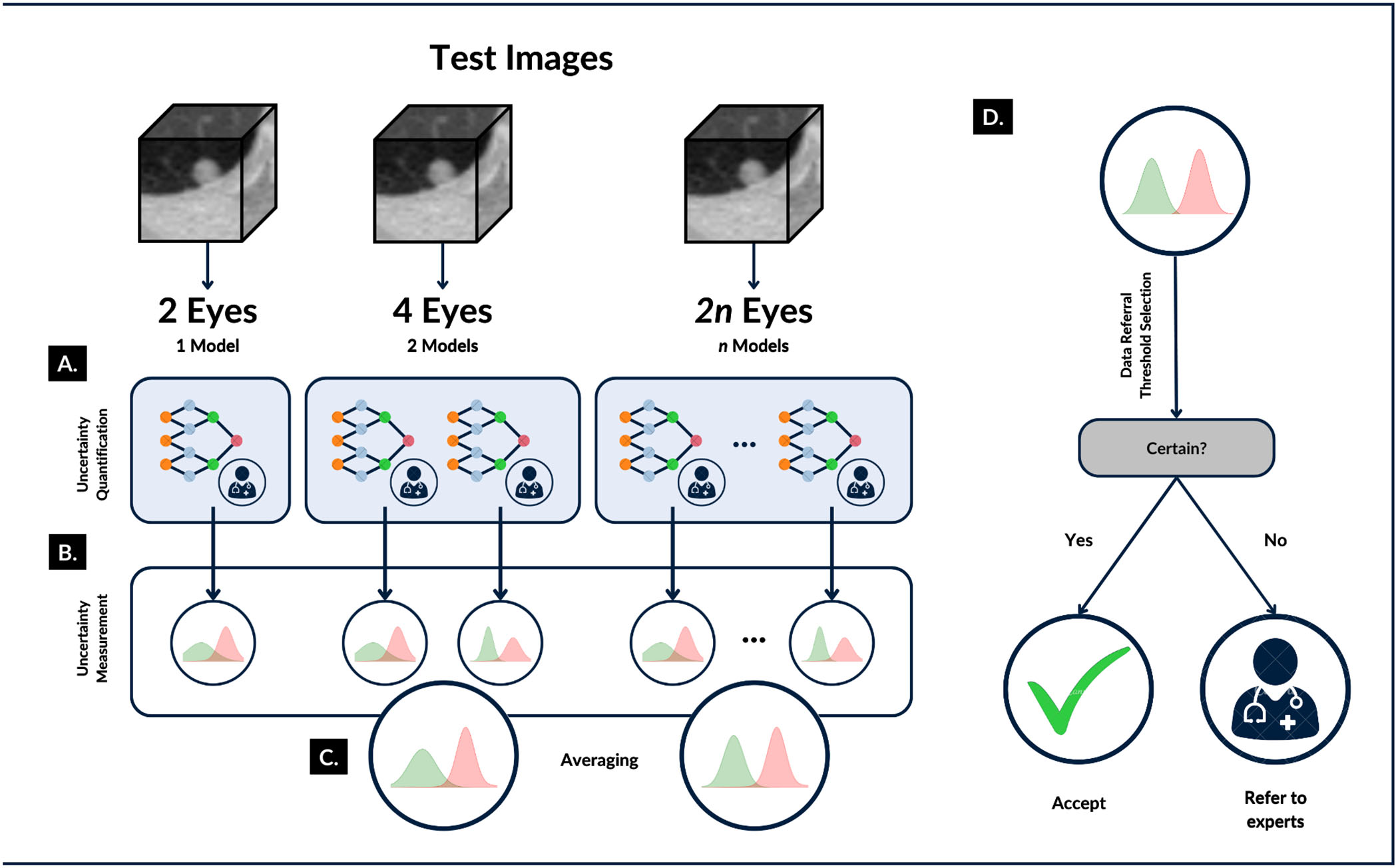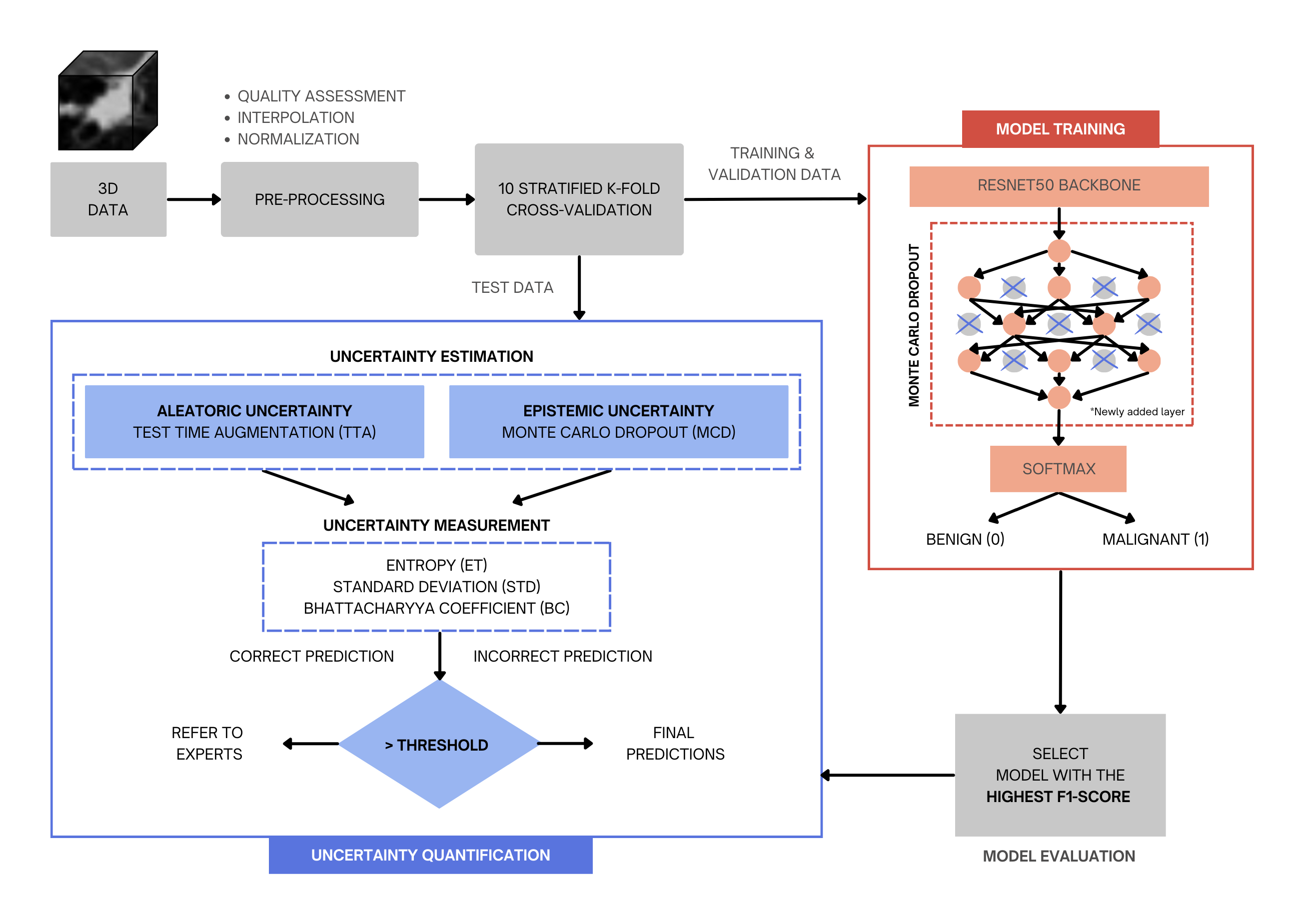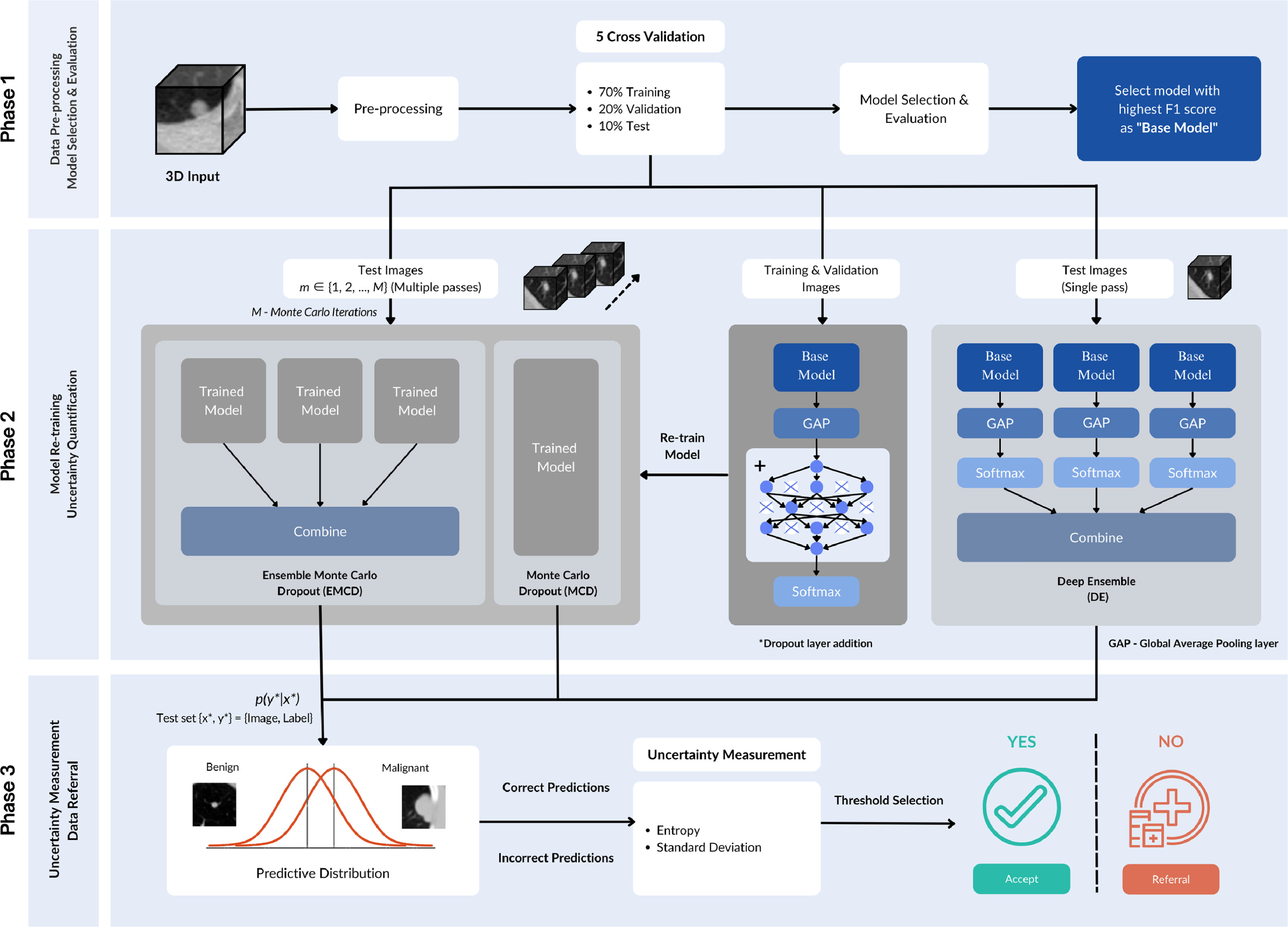 We propose an uncertainty-aware framework that includes three phases: data preprocessing and model selection and evaluation, uncertainty quantification, and uncertainty measurement and data referral for the classification of benign and malignant nodules using 3D CT images.